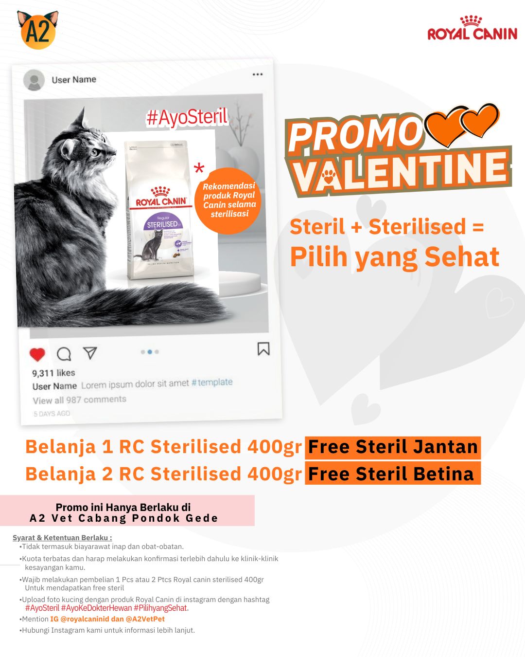 - Upload foto kucing dengan produk Royal Canin di instagram dengan hastag #AyoSteril #AyoKedokterHewan #Pilihyangsehat